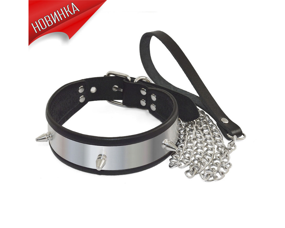Ошейник изготовлен из высококачественной кожи черного цвета. По краю изделия проходит оторочка, обеспечивающая комфортное использование. Особенностью данной модели является вставка, имитирующая металл, которая придаёт изделию эффектности.